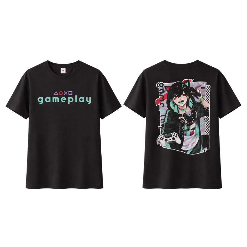 Featuring a clean “gameplay” logo with iconic controller symbols on the front, and a bold anime-style character design on the back, this tee is perfect for gamers and anime lovers.