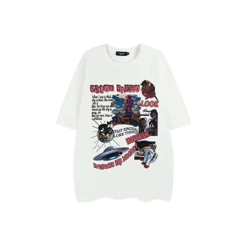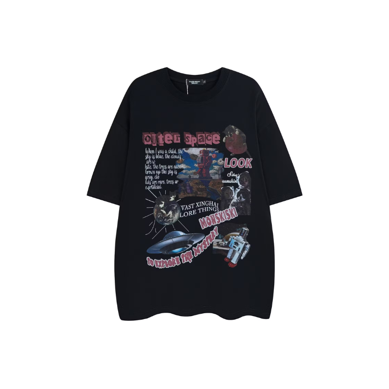 This Outer Space graphic t-shirt features a bold vintage collage design with planets, UFO, astronaut, and statement typography. The eye-catching print gives a trendy streetwear vibe, perfect for casual wear, outings, or layering.